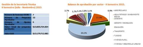 Se resaltó la gestión de la Secretaría Técnica ejercida por la Oficina de Planeación del Departamento que en el último semestre (Julio- Noviembre) llevó a cabo más de una sesión de OCAD por mes, y en promedio se aprobaron 6 proyectos igualmente cada mes. Los sectores con más alto porcentaje de recursos aprobados fueron Deporte y Recreación con el 60.3%, Agua potable y saneamiento básico con un 17.3% y transporte con un 8%. Informó Daniel Luna Fals, Jefe de la Oficina de Planeación del Departamento.