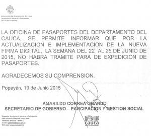 La oficina de pasaportes del departamento del Cauca se permite informar que por la actualizacion de la nueva firma digital, la semana del 22 al 26 de...