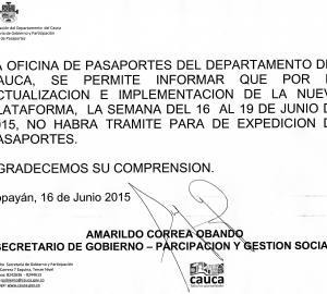 La oficina de pasaportes del departamento del Cauca se permite informar que por actualización e implementación de la nueva plataforma la semana del...