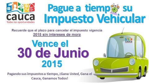 Popayán (Cauca) Pagando oportunamente el impuesto sobre vehículos, los propietarios de los mismos pueden ahorra dinero y evitar ser sujetos de procesos de cobro coactivo administrativo que pueden culminar con el embargo, secuestro y remate de su automotor o de otros bienes del deudor, así lo dio a conocer la secretaria de Hacienda Departamental, Astrid Paredes Fuentes, quien recordó a los dueños de los vehículos que el plazo para cancelar el impuesto vigencia 2015 sin intereses de mora ni sanción moratoria vence el próximo 30 junio de 2015.